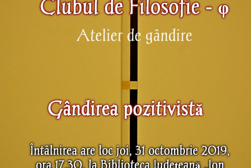 Joi, 31 octombrie 2019, ora 17.30, la sediul Bibliotecii Judeţene „I. H. Rădulescu” Dâmboviţa, Sala Multimedia (etaj I) are loc o nouă întâlnire a Clubului de filosofie.Tema dezbătută va fi: „Gândirea pozitivă”.Participarea este liberă.