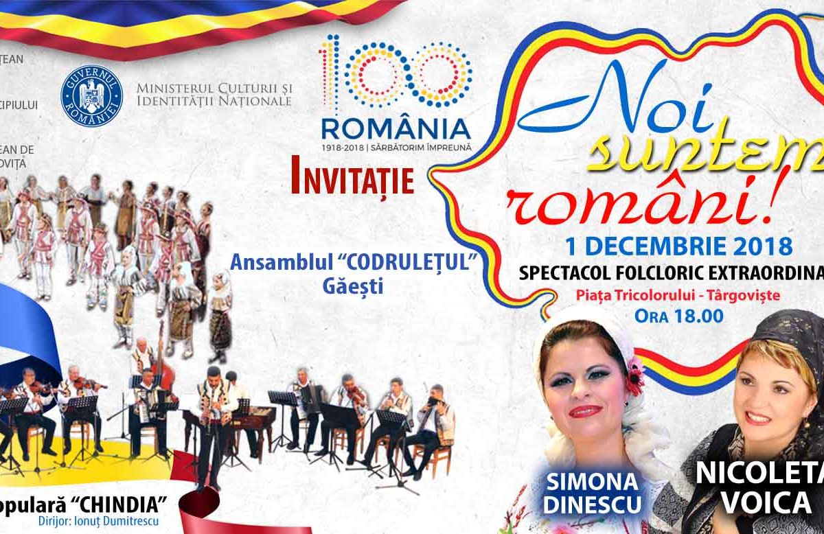 Ziua de 1 decembrie 2018 - Centenarul Marii Uniri - va fi sărbătorită la Târgoviște într-un cadru festiv, prin spectacolul folcloric extraordinar intitulat ”Noi suntem români!”