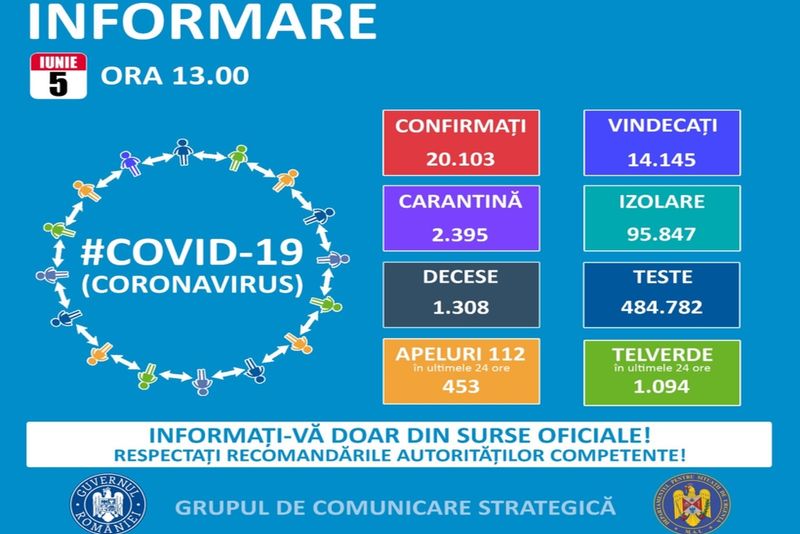 Până astăzi, 5 iunie, pe teritoriul României, au fost confirmate 20.103 de cazuri de persoane infectate cu virusul COVID – 19 (coronavirus). Dintre persoanele confirmate pozitiv, 14.145 au fost declarate vindecate și externate.În ultimle 24 de ore au fost confirmate 196 de cazuri noi, la nivel național. dintre acestea 6 sunt în judțul Dâmbovița, unde totalul ajunge la 305 cazuri.