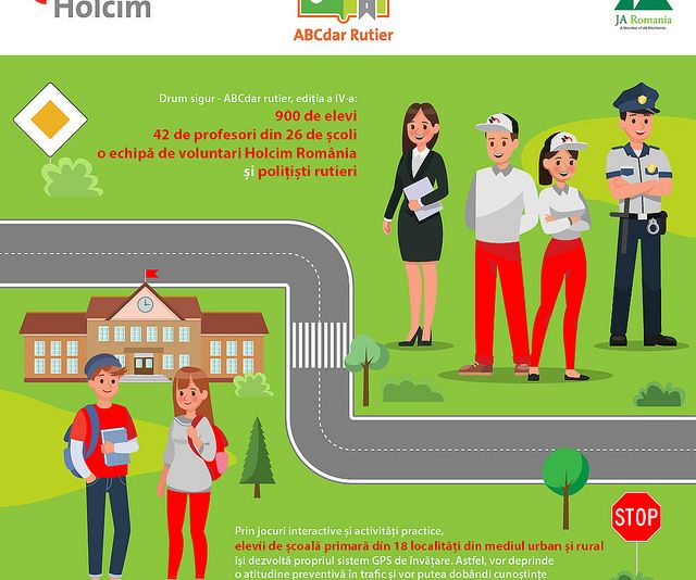 A patra ediție a programului educațional „Drum sigur – ABCdar rutier” începe în această toamnă pentru 900 de elevi de școală primară, din 18 localități preponderent rurale și mic urbane.Per total 26 de școli vor fi implicate în ediția 2018-2019, unde 42 de profesori vor susține activitățile și exercițiile care au loc pe parcursul mai multor ore desfășurate la clasă.Acestea vor fi desfășurate cu participarea voluntarilor Holcim România, precum și a polițiștilor de la Serviciul Rutier.Programul este dezvoltat de Junior Achievement (JA) România cu susținerea Holcim România și oferă acces gratuit la conținuturi și kit-uri de educație rutieră care le facilitează elevilor posibilități individuale de învățare și exersare a regulilor de circulație, pornind de la exemple din localitățile lor: deplasarea pe drumurile publice în condiții speciale, semnele și marcajele rutiere întâlnite în drum spre școală sau alegerea locului de joacă.”Credem că o educație rutieră sănătoasă începe încă de la o vârstă fragedă, nu doar din momentul în care tinerii pot aplica pentru permisul de conducere. Toți suntem actori în trafic, indiferent că suntem pietoni, șoferi, bicicliști etc. Iar un astfel de curs este binevenit pentru cei mici, în special datorită faptului că este foarte interactiv și bazat pe situații reale cu care aceștia se pot identifica. Holcim România pune întotdeauna siguranța pe primul loc, un principiu important cu care participanții rămân în gând după încheierea orelor de siguranță rutieră la clasă” – Alina Cristea, Manager Dezvoltare Durabilă Holcim România.În cadrul edițiilor anterioare, peste 2.000 de elevi din aceleași comunități au participat la proiect, 70% dintre aceștia beneficiind de prima experiență complexă de educație rutieră, derulată secvențial pe parcursul mai multor ore de curs.„Consider foarte bună decizia de a desfășura acest program la clasă, deoarece, pe parcursul activităților, mi-am dat seama că elevii mei aveau puține cunoștințe despre regulile de circulație pe care trebuie să le respecte pe drumurile publice. Au fost foarte interesați de activitățile dedicate prevenirii accidentelor în timpul deplasării spre școală și alegerii locurilor de joacă sigure. Am observat că adesea făceau conexiuni cu lecțiile de la alte discipline; așteptau cu nerăbdare următoarele activități și purtau discuții legate de acestea chiar și în timpul pauzelor.” – profesor pentru învățământul primar, Școala Gimnazială Ion Agârbiceanu, Cluj-NapocaÎn acest an școlar, la programul „Drum sigur – ABCdar rutier” participă 26 de școli și structuri din 18 localități: Câmpulung, Cetățeni, Stâlpeni, Stoenești, Valea Mare-Pravăț (Argeș), Aleșd, Aștileu, Oradea, Țețchea (Bihor), Brașov (Brașov), Cluj-Napoca, Turda (Cluj), Tărtășești, Voinești (Dâmbovița), Chitila (Ilfov), Horia, Roman (Neamț) și Timișoara (Timiș).Proiectul este dezvoltat pe baza programei de educație rutieră elaborată în 2015 de Ministerul Educației Naționale și susține Strategia Națională pentru Siguranță Rutieră adoptată în 2016, care prevede întărirea rolului educației și al campaniilor de sensibilizare și conștientizare.