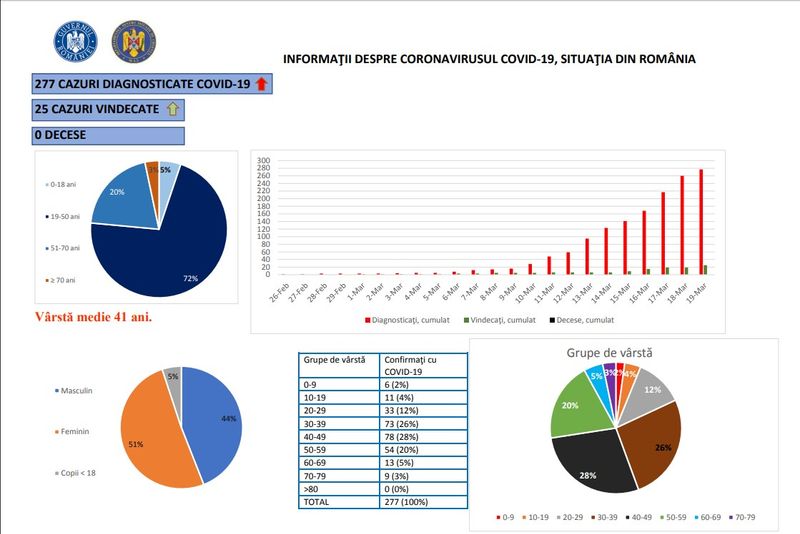 Până joi, 19 martie, pe teritoriul României, au fost confirmate 277 de cazuri de persoane infectate cu virusul COVID – 19 (coronavirus). Dintre cele 277 de persoane confirmate pozitiv, 25 au fost declarate vindecate și externate ( 16 la Timișoara, opt la București și unul la Iași), a informat Grupul de Comunicare Strategică. În continuare în județul Dâmbovița nu este niciun caz confirmat.