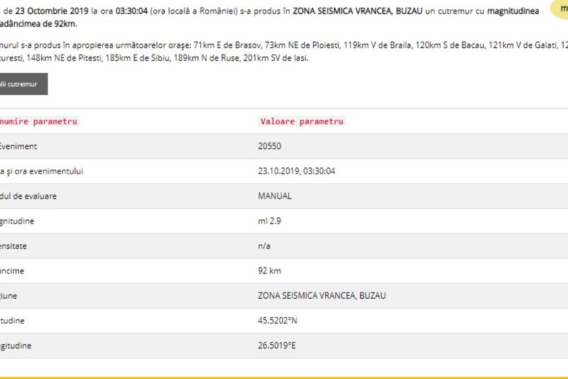 "În ziua de 23 Octombrie 2019 la ora 03:30:04 (ora locală a României) s-a produs în ZONA SEISMICA VRANCEA, BUZAU un cutremur cu magnitudinea ml 2.9, la adâncimea de 92km.