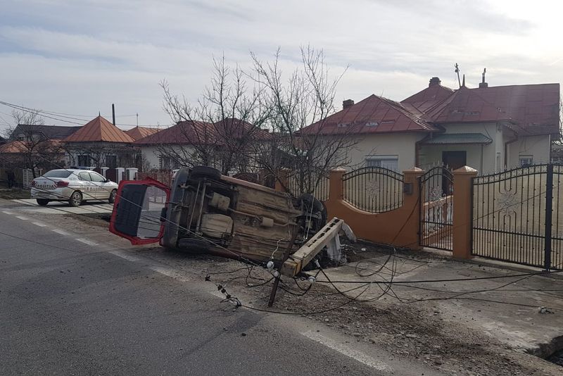 Accident ca-n filme pe DN 72. Un stâlp de electricitate a fost retezat de o mașină