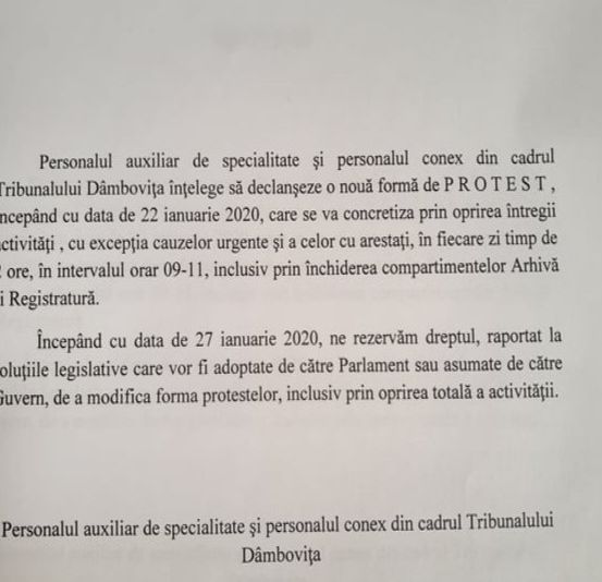 Deasemenea și personalul auxiliar, de la Tribunalul Dâmboviță, a anunțat măsuri de protest (vezi foto mai sus), începând din 22 ianuarie, dar deocamdată doar în intervalul orar 9-11. Vor fi închise inclusiv Arhiva și Registratura.