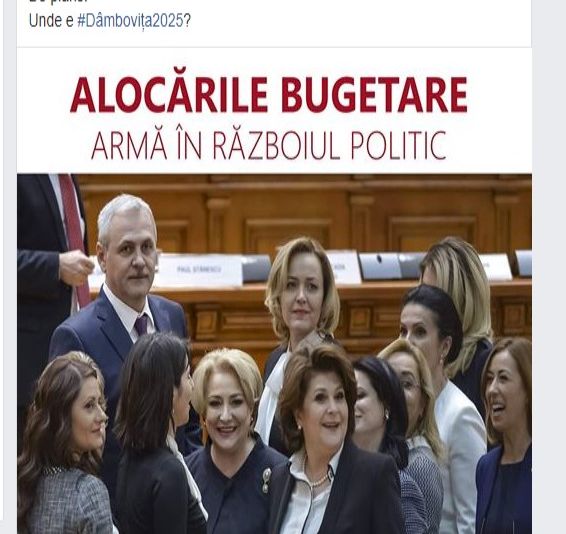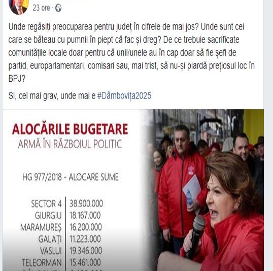 "De plâns! Unde e Dâmbovița #2025? Alocările bugetare armă în războiul politic" a scris A.Țuțuianu.