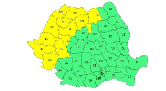 Potrivit sursei citate, de atenționare sunt vizate judeţele Satu Mare, Maramureş, Bistriţa-Năsăud, Sălaj, Cluj, Bihor, Arad, Timiş, Caraş-Severin, Hunedoara şi, parţial, Alba, Mureş şi Suceava.
