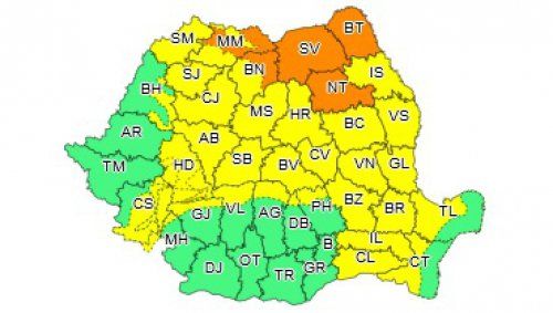 COD GALBEN În intervalul 22 iunie, ora 13 – 22 iunie, ora 23, în zonele de deal și de munte, precum și în Moldova, Transilvania, Maramureș, estul Munteniei și vestul Dobrogei vor fi perioade cu instabilitate atmosferică accentuată ce se va manifesta prin averse torențiale, frecvente descărcări electrice, intensificări ale vântului, vijelii și grindină. Cantitățile de apă vor depăși 20...25 l/mp și pe arii restrânse 40...50 l/mp.
