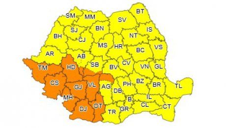 COD PORTOCALIU Potrivit ANM, în intervalul 23 iunie, ora 15 – 24 iunie, ora 15, În județele Timiș, Caraș-Severin, Mehedinți, Gorj, Vâlcea, Dolj, Olt, Hunedoara, precum și zona montană și submontană a județelor Argeș, Sibiu și Alba se vor semnala manifestări de instabilitate atmosferică accentuată. Vor fi averse torențiale, intensificări puternice ale vântului, vijelii, grindină și frecvente descărcări electrice. În intervale scurte de timp sau prin acumulare, se vor înregistra cantități de apă ce vor depăși 40 l/mp și izolat 60...70 l/mp.