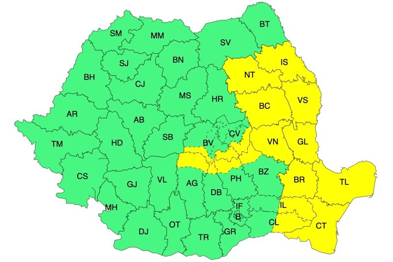 În județele Vaslui, Bacău, Vrancea, Galați, Buzău, Prahova, Brăila, Ialomița, Călărași, Constanța, Tulcea, Ilfov și în municipiul București, vântul va avea intensificări cu rafale de 50...70 km/h.