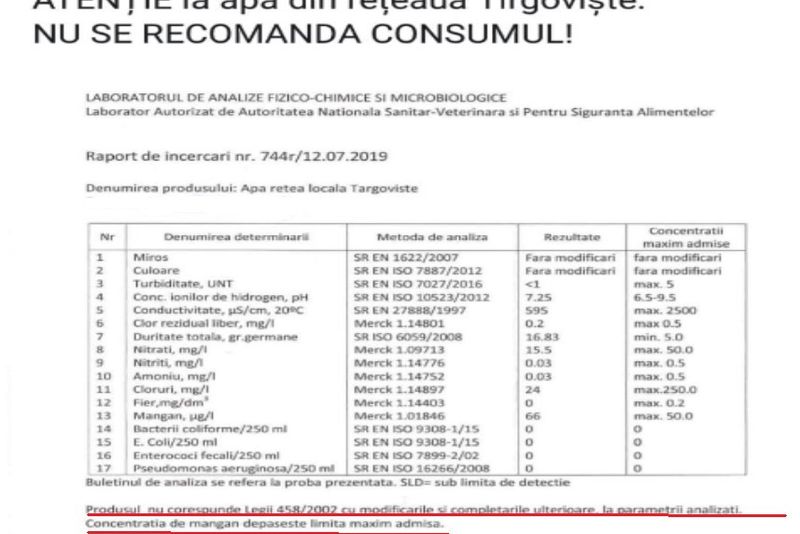 Buletinul de analize a fost postat pe o rețea de socializare (facebook), iar din acest buletin (datat 12 iulie 2019) reiese că produsul (apă rețea locală Târgoviște):