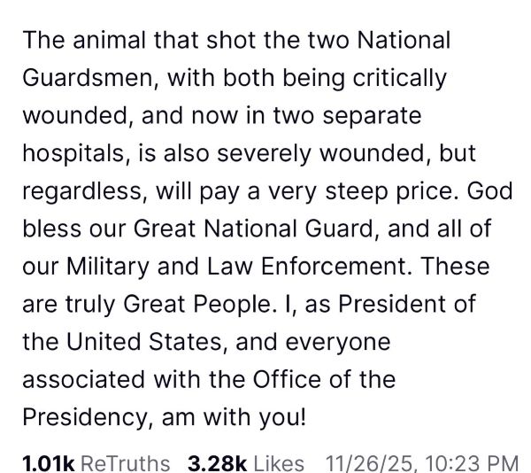 ”Animalul care a împuşcat cei doi membri ai Gărzii Naţionale, ambii fiind răniţi grav şi aflaţi acum în două spitale diferite, este şi el grav rănit, dar, indiferent de asta, va plăti un preţ foarte mare. Dumnezeu să binecuvânteze Marea noastră Gardă Naţională şi toate forţele noastre militare şi de ordine. Aceştia sunt cu adevărat oameni minunaţi. Eu, în calitate de preşedinte al Statelor Unite, şi toţi cei asociaţi cu Biroul Preşedinţiei, suntem alături de voi!”, a scris Donald Trump pe Truth Social.
