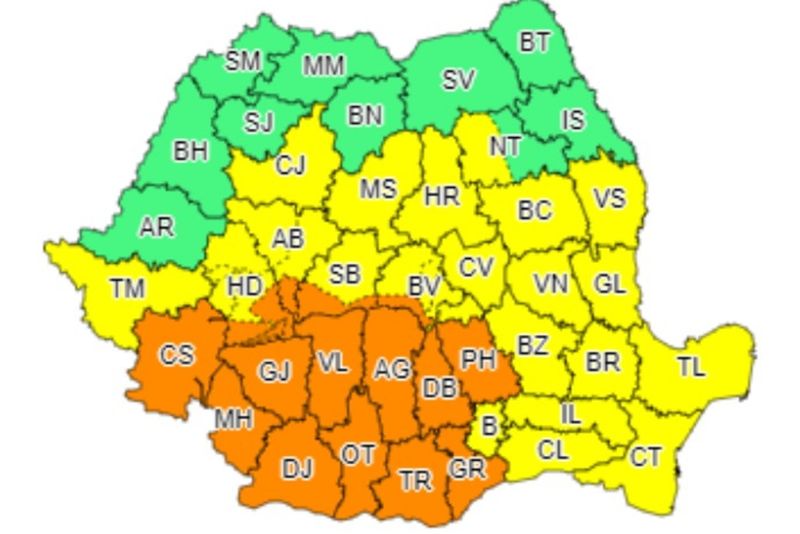 În intervalul menționat, în Oltenia, local în Muntenia, în sudul Banatului și în zona Carpaților Meridionali, instabilitatea atmosferică va fi accentuată. Vor fi vijelii, grindină, descărcări electrice și va ploua torențial, astfel încât, în intervale scurte de timp sau prin acumulare, se vor înregistra cantități de apă ce vor depăși 40...50 l/mp și izolat 60...70 l/mp.