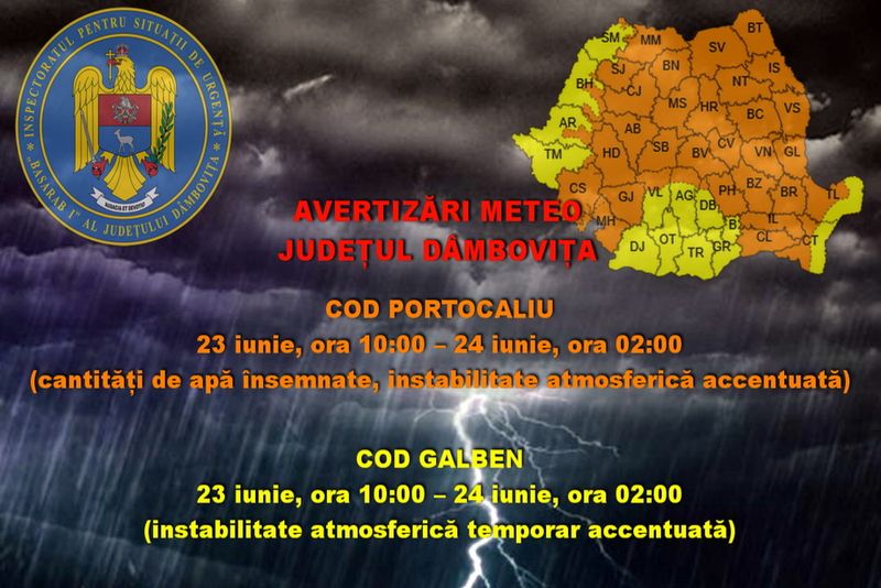 Începând de astăzi – 23 iunie, de la ora 10:00, până mâine – 24 iunie, la ora 02:00, județul Dâmbovița se va afla sub incidența avertizărilor COD PORTOCALIU (nordul județului) și COD GALBEN (restul județului), caracterizate de instabilitate atmosferică accentuată, averse torențiale, vijelii, grindină, descărcări electrice.