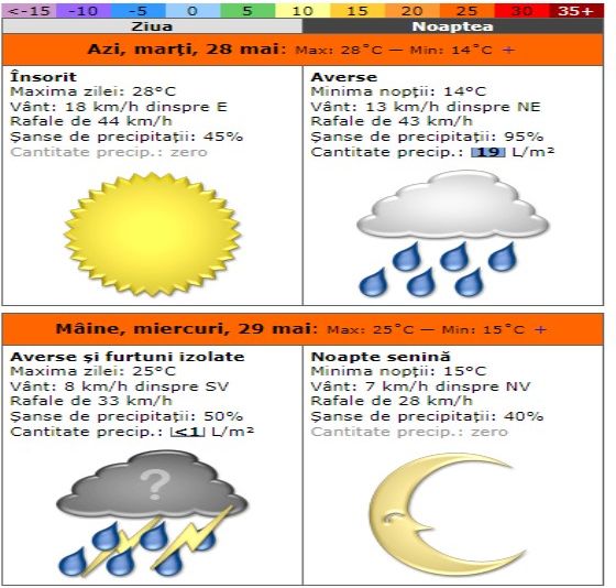 În noaptea de 28-29 mai sunt așteptate precipitații ce este posibil să ajungă și la valoarea de 19 l/mp, iar temperatura minimă, pe timpul nopții, va scădea până la valoarea de 14 grade Celsius.