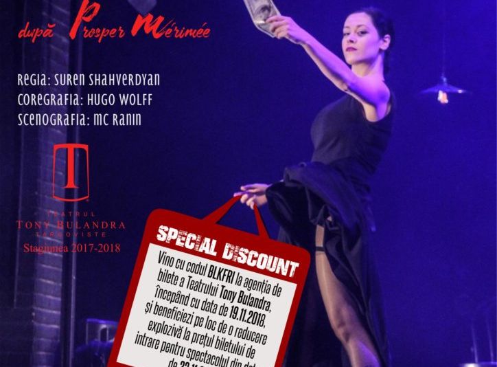 Teatrul Tony Bulandra organizează pentru cel de-al treilea an consecutiv Black Friday Theater Event.„Vino cu codul BLKFRI la Agenția de bilete a Teatrului Tony Bulandra din Târgoviște, începând cu data de 19.11.2018, și beneficiezi pe loc de o reducere explozivă la prețul biletului de intrare pentru spectacolul CARMEN, de vineri 23.11.2018”, se arată într-un comunicat de presă al Teatrului Tony Bulandra.CARMEN este o poveste de dragoste plină de pasiune transformată într-un spectacol care dezvăluie multiplele faţete ale talentului actorilor.Relaţia dintre Carmen şi Don Jose prinde contur în povestea cadru a distribuirii rolurilor şi a punerii în scenă a piesei ce poartă numele personajului principal feminin.Acest scenariu, de tip matrioșca, face ca spectacolul să fie mult mai captivant. Carmen este imaginea feminității și a ferocității în același timp.
