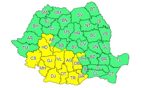 Sunt vizate de această atenţionare judeţele Alba, Argeş, Caraş-Severin, Dâmboviţa, Dolj, Gorj, Giurgiu, Hunedoara, Mehedinţi, Olt, Prahova, Sibiu, Teleorman şi Vâlcea.