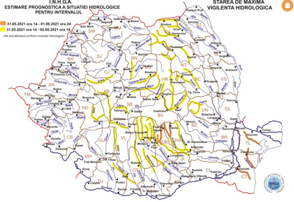 “În intervalul 31.05.2021 ora 14:00 – 01.06.2021 ora 24:00 pe râurile din bazinele hidrografice: Dâmboviţa – afluenţii aferenţi sectorului aval Ac. Pecineagu - amonte Ac. Văcăreşti (judeţele: Argeş şi Dâmboviţa), Ialomiţa – bazin superior şi afluenţii aferenţi sectorului amonte S.H. Siliştea Snagovului (judeţele: Dâmboviţa şi Prahova), Prahova – bazin superior (judeţul Prahova), râurile din Dobrogea (judeţele: Tulcea şi Constanţa).