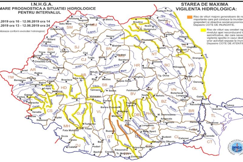 În intervalul 11.06.2019 ora 16:00 – 12.06.2019 ora 14:00 pe râurile din bazinele hidrografice: Vedea - bazin superior şi afluenţi bazin mijlociu şi inferior (judeţele Argeş, Olt şi Teleorman), afluenţii din bazinele inferioare ale Argeşului şi Dâmboviţei (judeţele Argeş, Dâmboviţa, Ilfov, Teleorman şi Giurgiu.