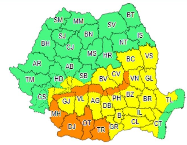 În județele Mehedinți, Dolj, Olt, Teleorman, precum și în zona montană și submontană a județelor Gorj, Vâlcea, Argeș, Dâmbovița, Prahova, Buzău și Vrancea va ploua abundent, iar în intervale scurte de timp sau prin acumulare se vor înregistra cantități de apă ce vor depăși 40 l/mp și izolat 50...70 l/mp. Aversele vor fi însoțite de descărcări electrice, intensificări ale vântului, vijelii și grindină.