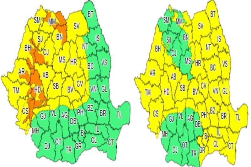 În zona de munte a județelor Cluj, Sălaj, Bihor, Arad, Timiș, Hunedoara, Maramureș, Bistrița-Năsăud și Caraș Severin vor fi precipitații abundente și se vor acumula local 40...50 l/mp.