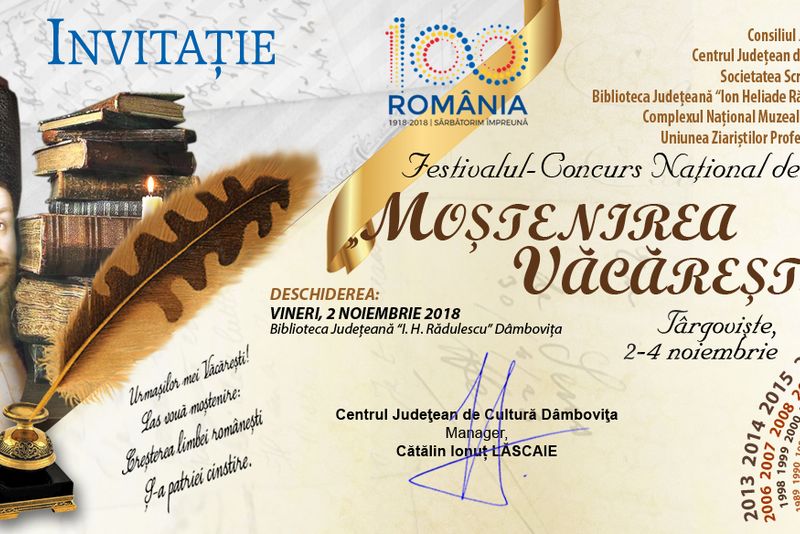 Cea de-a 50-a ediție a Concursului Național de Literatură „Moștenirea Văcăreștilor”, se va desfășura la Târgoviște în perioada 2-4 noiembrie 2018. Concursul are patru secțiuni și se adresează tuturor creatorilor cu vârsta de până în 40 de ani, din România.