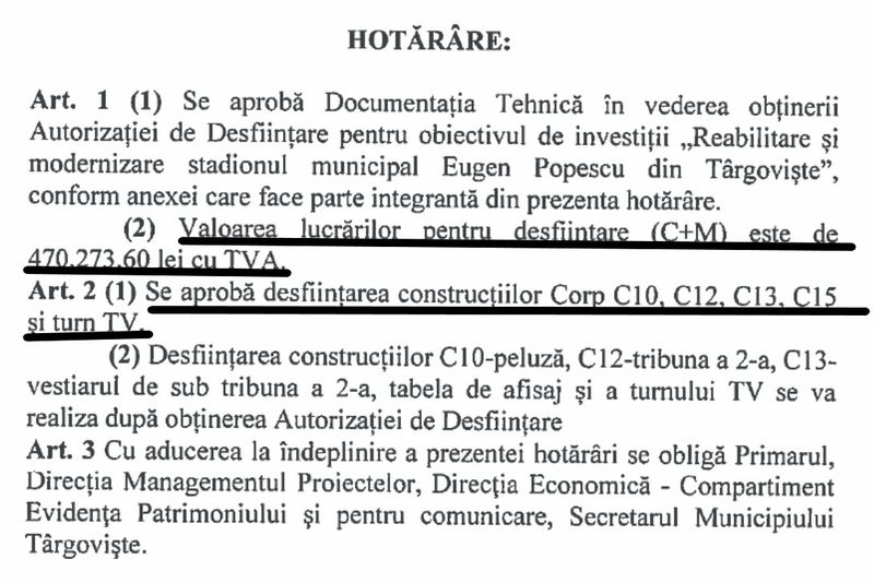 "Se aprobă documentația tehnică pentru obținerea autorizației de desființare pentru obiectivul de investiții "reabilitare și modernizare stadion <Eugen Popescu> din Târgoviște"