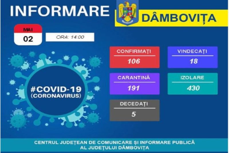 În aceiași zi, Prefectura Dâmbovița, citând un raport al celor de la DSP Dâmboviță, preciza faptul ca în județul Dâmbovița sunt, în supravegherea Direcției de Sănătate Publică, 106 cazuri confirmate. Tot în acelasi comunicat fiind anunțat si faptul că, în Dâmbovița, s-au videcat 18 persoane, iar în carantină instituționalizată sunt 191 de persoane, iar în izolare la domiciliu 430 de persoane asimptomatice.