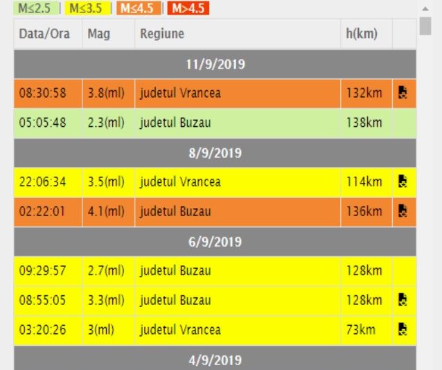 Institutul National de Cercetare Dezvoltare pentru Fizica Pamantului (INCDFP) transmite: In ziua de 11/09/2019 la ora 05:05:48(ora Romaniei) s-a produs in Zona seismica Vrancea, judetul Buzau un cutremur cu magnitudinea 2.3 pe scara Richter, la adancimea de 138km.