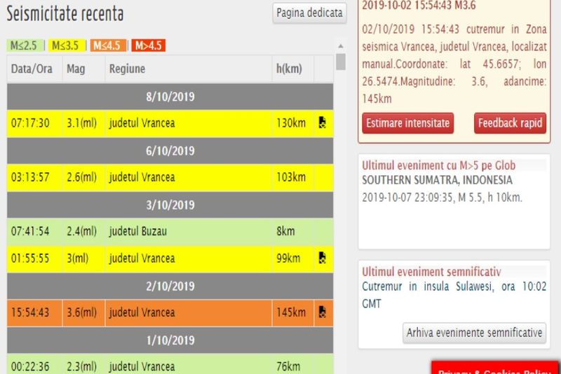 08/10/2019 07:17:30 cutremur in judetul Vrancea, localizat manual.Coordonate: lat 45.7628; lon 26.7214.Magnitudine: 3.1(ml), adancime: 130km