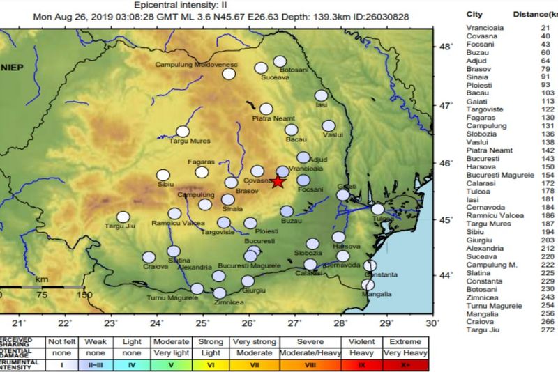 Un cutremur cu magnitudinea 3,6 a avut loc luni dimineață (26 august 2019) în zona Vrancea. Cutremurul nu a provocat pagube dar este cel mai mai mare din ultima vreme, din zona Vrancea, unde a fost înregistrată o activitate puternică în ultimele luni.