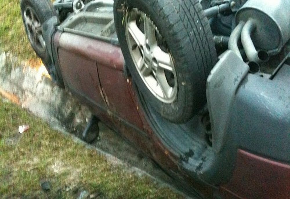 Două persoane au scăpat cu viață, duminică seara, după ce mașina în care se aflau s-a răsturnat, părăsind partea carosabilă.