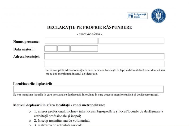 O nouă declarație pe propria răspundere a fost emisă, VINERI, de autorități. Aceasta trebuie completată pentru deplasările în afara localității.