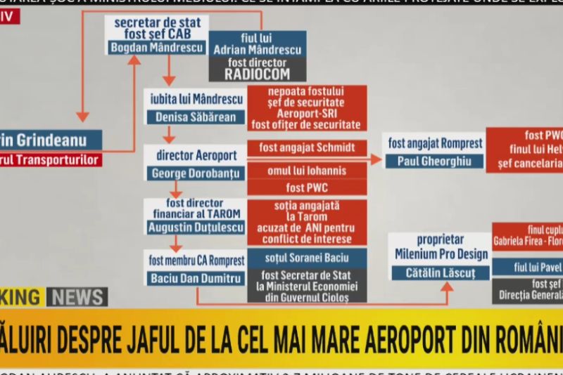 Afacerile de la Aeroportul Otopeni și Tarom sunt orchestrate de ani de zile de persoane pentru care nașii, tații și susținătorii politici și-au dat mâna cu scopul de a acoperi cel mai mare jaf de bani din instituțiile statului. Pe listă sunt George Dorobanțu, actualul director general al Companiei naționale Aeroporturi București, Bogdan Mîndrescu, cel care ia toate deciziile din Ministerul Transporturilor, Augustin Duțulescu, fost șef al Tarom și Dan Dumitru Baciu, fost director CNAB. „Încrengăturile” de la aeroportul Otopeni au fost prezentate, în exclusivitate, marți seară, la Culisele statului paralel, cu Anca Alexandrescu.