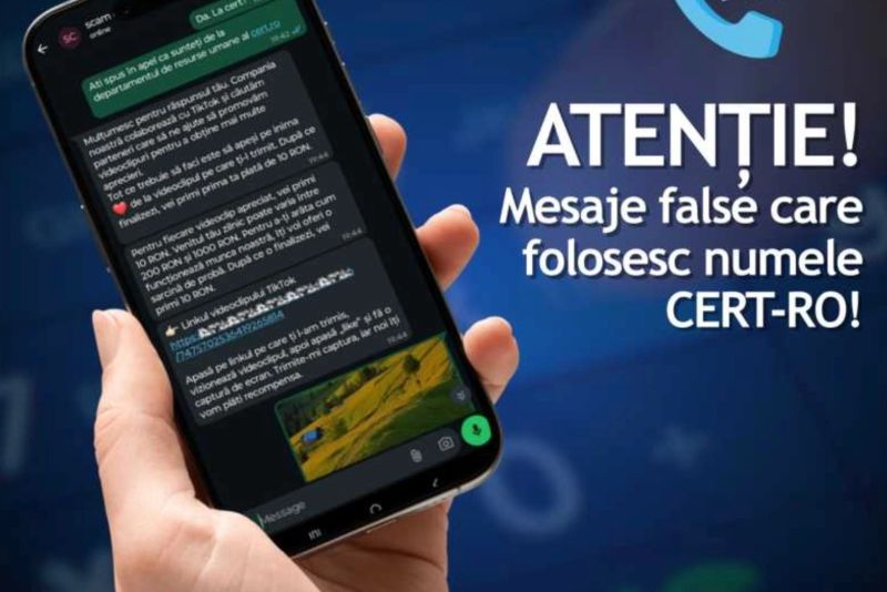 "Ați primit pe WhatsApp un mesaj de la Departamentul de Resurse Umane CERT.RO, care vă promite câștiguri de până la 1.000 lei/zi pentru a da like la videoclipuri? Este o tentativă de fraudă prin apeluri false în numele unor instituții sau autorități - o înșelătorie digitală prin care atacatorii se folosesc de identitatea fostului CERT-RO pentru a vă fura datele personale și financiare. După ce utilizatorii adaugă în agendă numărul indicat, urmează mesaje prin care li se cer informații confidențiale, li se trimit linkuri către pagini false sau solicitări de coduri de autentificare", arată DNSC, într-o postare pe propria pagină de Facebook.