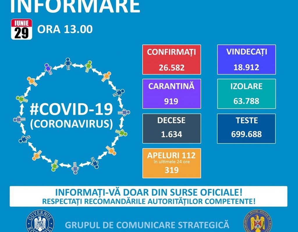 Până astăzi, 29 iunie, pe teritoriul României, au fost confirmate 26.582 cazuri de persoane infectate cu noul coronavirus (COVID – 19). Dintre persoanele confirmate pozitiv, 18.912 au fost declarate vindecate și externate. În ultimle 24 de ore au fost realizate doar aproximativ 4800 de teste la nivel național, rezultând 269 de cazuri noi de coronavirus. Dintre acestea 6 sunt în Dâmbovița, unde totalul ajunge la 513 cazuri.