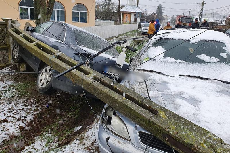 După ce au ricoșat în afara părții carosabile una dintre mașini a retezat stâlpul de electricitate, acesta căzând peste mașină. A fost o adevărată minune că ocupanții autoturismului nu au fost striviți de stâlpul de beton.
