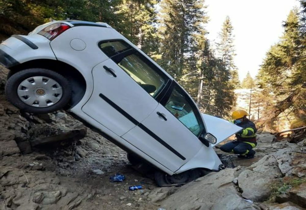 Un bărbat și o femeie au căzut, în această după amiază, cu mașina într-o prăpastie de circa 20 de metri între Cabana Dichiu și Lacul Bolboci, din Munții Bucegi.