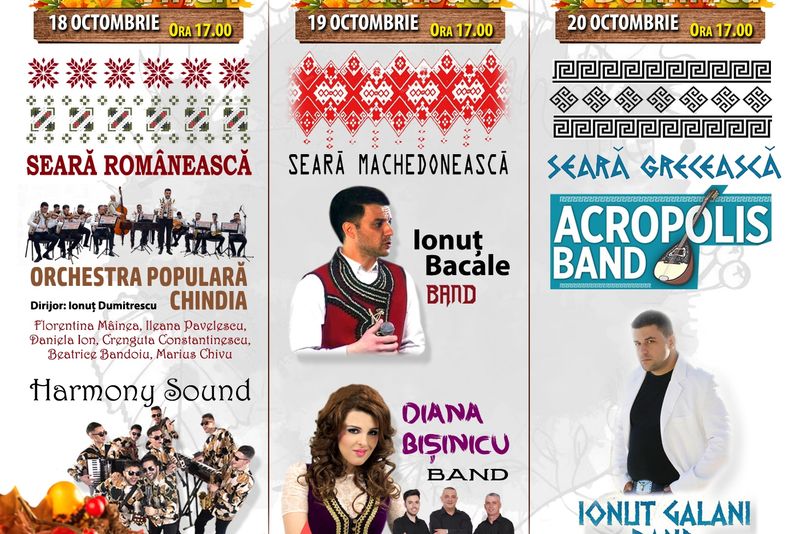 Consiliul Județean Dâmbovița, prin Centrul Județean de Cultură, alături de Primăria Municipiului Târgoviște și Direcția Județeană pentru Agricultură organizează, în perioada 18-20 octombrie, evenimentul "Festivalul Toamnei".Evenimentul, ajuns la cea de-a doua ediție, va avea loc în Parcul Mitropoliei din Târgoviște și reunește producători locali de legume, fructe, fermieri, meșteșugari și artizani, într-un concept menit să pună în valoare potențialul agriculturii dâmbovițene.În cele trei zile ale festivalului, doritorii vor putea să își facă provizii pentru toamnă. De asemenea, vor putea degusta mâncăruri tradiționale alături de o cană de must.Pe scena din Piața Mihai Viteazul, Centrul Județean de Cultură a pregătit trei seri speciale, inedite.Vineri este Seara românească, alături de Orchestra Populară Chindia, iar apoi trupa târgovișteană, Harmony Sound.Sâmbătă vom dansa pe ritmuri armânești cu Ionuț Bacale și cunoscuta machedoneancă Diana Bișinicu și bandul ei.Festivalul se va încheia în spiritul grecesc alături de Trupa Acropolis și îndrăgitul interpret Ionuț Galani.