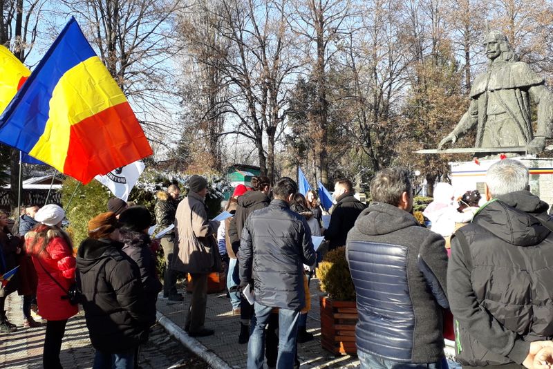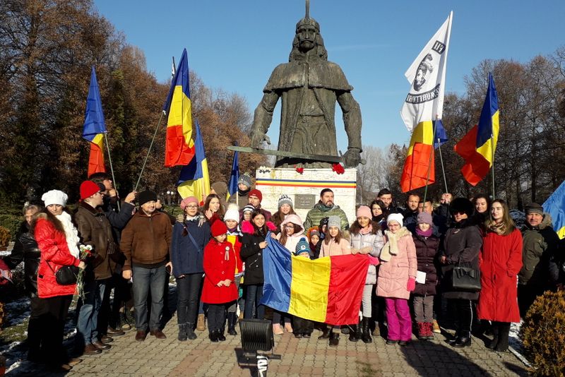 Foto-Video| Centenarul altfel. Ziua națională, cu flori și cântece patriotice la statuia lui Vlad Țepes