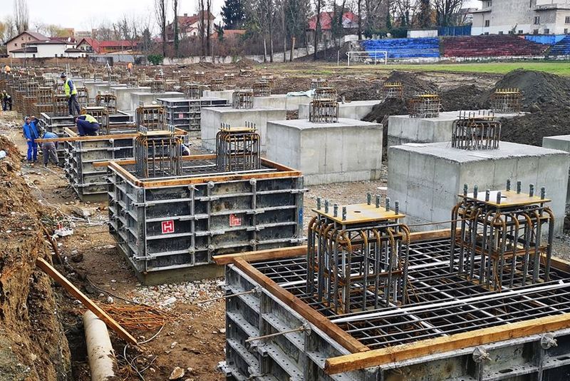"S-au turnat deja 50 dintre cei 69 de cuzineti de sustinere a noii tribune.? Cu o greutate care variaza intre 50 si 85 de tone fiecare, aceste structuri din beton armat reprezinta elementele principale ale fundatiei noii constructii.In cateva zile, aceasta etapa va fi finalizata."