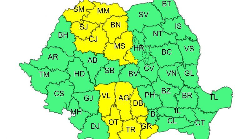 În județele Maramureș, Satu-Mare, Sălaj, Cluj, Bistrița-Năsăud, Mureș, Vâlcea, Argeș, Dâmbovița, Olt, Teleorman, Giurgiu și local în Harghita vor fi perioade cu instabilitate atmosferică accentuată ce se va manifesta prin averse torențiale, frecvente descărcări electrice, grindină și vijelii. Cantitățile de apă vor depăși 25 l/mp și izolat 40...50 l/mp.