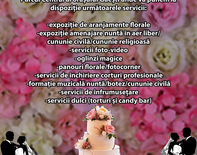 Cei care nu și-au plănuit încă nunta în cele mai mici detalii, pot participa la un spectaculos târg, unde pot contracta cele mai noi și cele mai bune servicii din domeniu. Evenimentul are loc sâmbătă, 29 iunie, incepand cu ora 10.00, în Parcul Central din Găești.Specialiștii te așteaptă cu expoziții de aranjamente florale, servicii foto-video, închiriere corturi profesionale, formații de muzică live, candy baruri și torturi, servicii de înfrumusețare, dar și cu noutățile și ultimele trenduri în materie de evenimente: cabine magice, panouri florale și foto corner, expoziții de amenajare a nunții/cununiei civile sau religioase în aer liber.„Vino să îi cunoști pe cei care pot face din evenimentul tău o poveste de vis, de care să-ți amintești cu mult drag peste ani. Vei avea parte de experiențe frumoase, demonstrații gratuite și de reduceri mari de prețuri. De asemenea, te vei distra cu siguranță, intrând în atmosfera pe care organizatorii au pregătit-o special pentru tine”, au precizat organizatorii evenimentului.