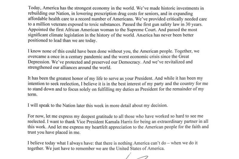 "Am luat această decizie după multă reflecție și consultare cu familia mea și echipa mea de consilieri. Consider că este momentul să facem loc noilor idei și viziuni în politica americană," a declarat Biden, care a ocupat funcția de președinte din ianuarie 2021.