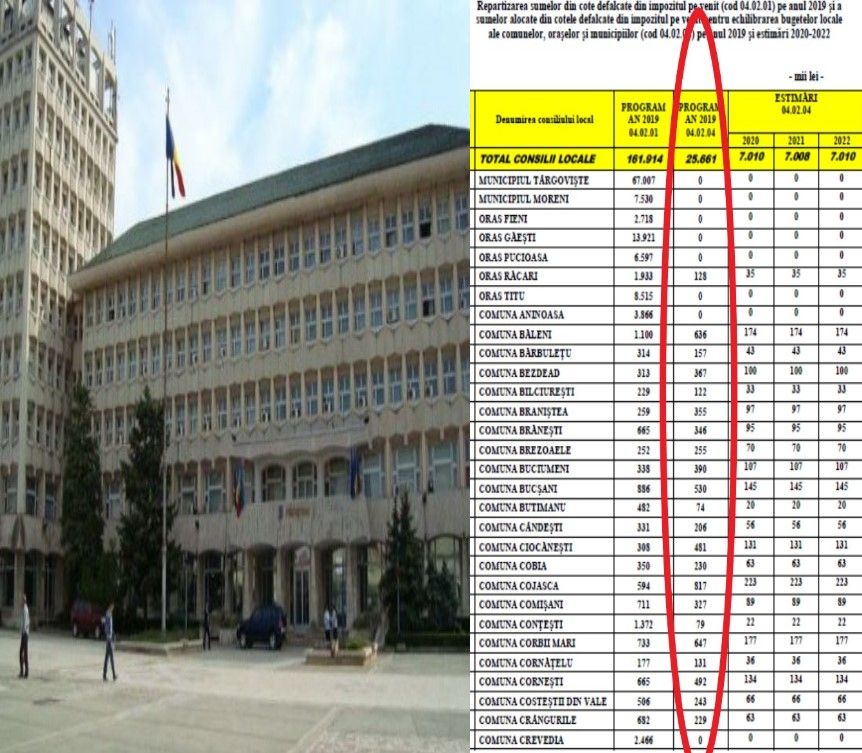 Consiliul Județean Dâmbovița adoptă astăzi,22 martie 2019, o hotărâre de consiliu prin care sunt repartizate, celor 89 de UAT-uri din județ, cotele defalcate din impozitul pe venit pe anul 2019 şi a sumelor alocate din cotele defalcate din impozitul pe venit, pentru echilibrarea bugetelor locale ale comunelor, oraşelor şi municipiilor pe anul 2019, respectiv repartizarea sumelor defalcate din taxa pe valoarea adaugată pentru echilibrarea bugetelor locale ale comunelor, oraşelor şi municipiilor pe anul 2019. În total este vorba de peste 462 milioane de lei.