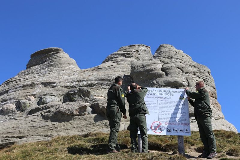 Administrația parcului a montat un nou panou prin care se interzice escaladarea Sfinxului și încălcarea perimetrului de protecție al acestuia, au discutat cu turiștii și au distribuit materiale informative cu privire la Parcul Natural Bucegi și reguli de conduită în această arie protejată.