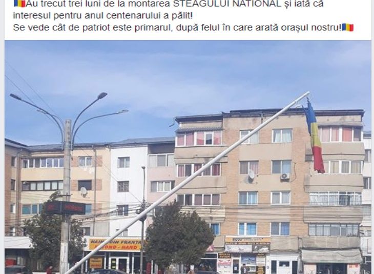 "Au trecut trei luni de la montarea STEAGULUI NATIONAL și iată că interesul pentru anul centenarului a pălit!Se vede cât de patriot este primarul, după felul în care arată orașul nostru!"