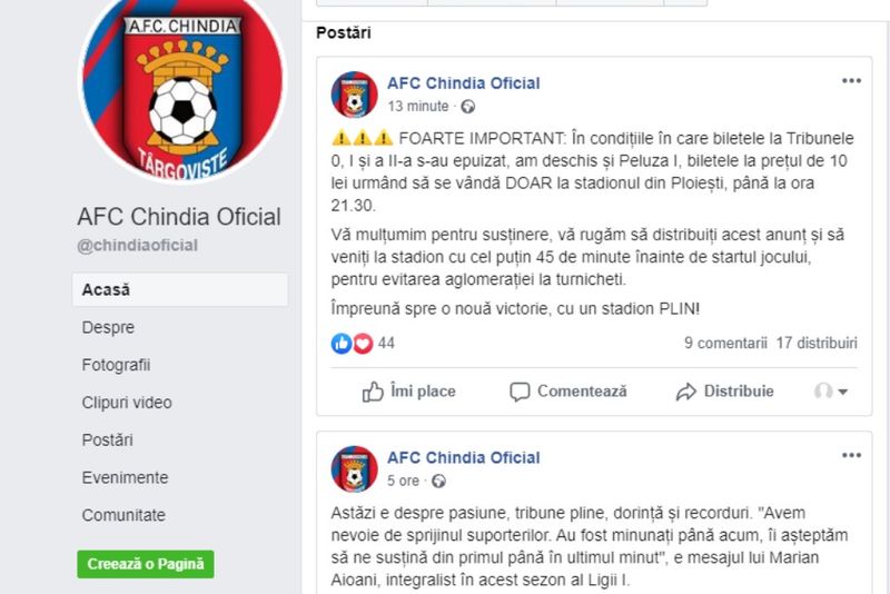 Cu ore bune înainte de debutul meciului din liga I de fotbal, dintre Chindia și FCSB, organizatorii au anunțat că au epuizat toate biletele ce erau scoase la vânzare. Clubul organizator al meciului, ce va avea loc pe stadionul "Ilie Oană" din Ploiești, a anunțat că se pun în vânzare bilete și la peluze. Este pentru prima oară când se întâmplă acest lucru, la un meci al Chindiei, pe stadionul din Ploiești.