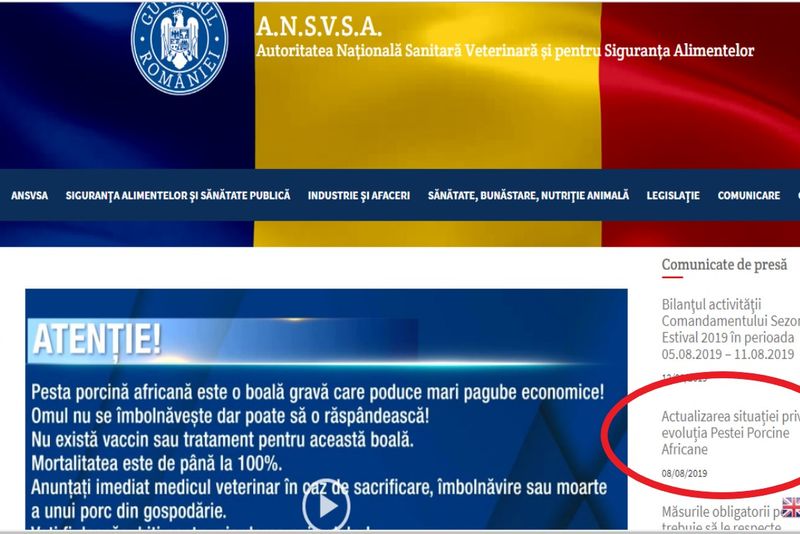 La nivel central, ANSVSA-ul procedează identic, cu toate că aici situația este ceva mai actuală, respectiv data de 8 august 2019. Cu toate acestea cea mai recentă centralizarea a datelor (din 12 august nu apare postată pe site), cazurile, conform informațiilor, fiind mai multe, la ultima actualizare (nepublicată), cu aproape 200, față de statistica din data de 8 august.