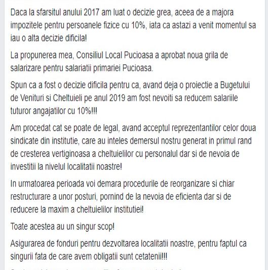Astăzi, (22 ianuarie 2019), prin votul Consiliului Local Pucioasa, salariile anagajaților din administație au fost micșorate, după cum a anunțat, pe facebook, chiar edilul șef al orașului.