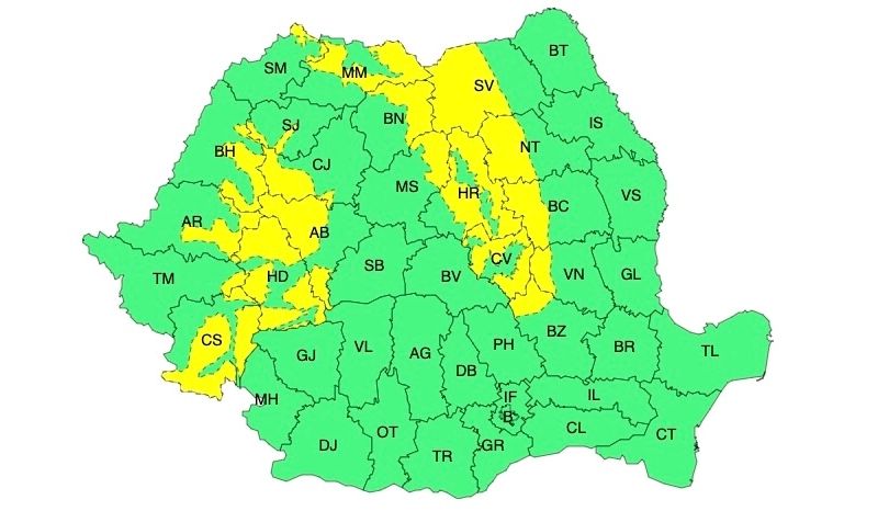 Fenomene vizate și zone afectate: precipitații moderate cantitativ în Carpații Occidentali, vestul Carpaților Meridionali și în nordul Carpaților Orientali (județele Satu Mare, Maramureș, Bistrița-Năsăud și Mureș)